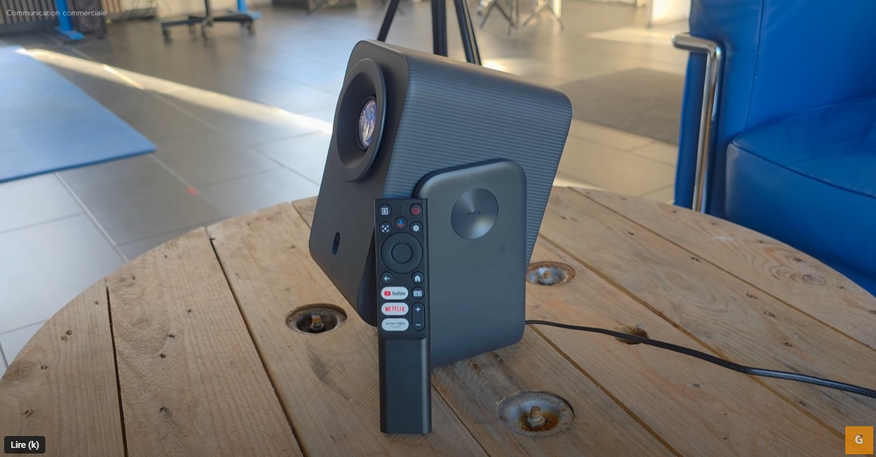 L’intégration de Google TV apporte aussi l’Assistant Google. La télécommande possède un bouton dédié et un micro. J’ai testé plusieurs commandes vocales. J’ai demandé : « Trouve-moi une vidéo de la chaîne Gigatop ». Le projecteur a immédiatement trouvé la chaîne et affiché les dernières vidéos. J’ai aussi essayé : « Lance-moi l’application Netflix ». L’application s’est ouverte en quelques secondes. C’est fluide, rapide et très pratique au quotidien. Enfin, qui dit Google TV dit aussi Chromecast intégré. Je peux donc diffuser le contenu de mon téléphone directement sur le projecteur. C’est idéal pour partager des photos de vacances ou des vidéos rapidement.