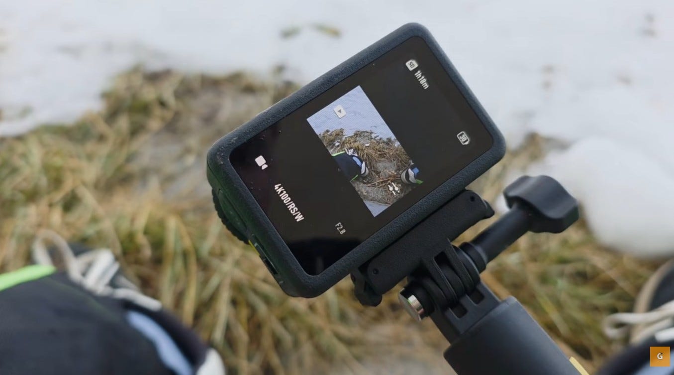 La définition du capteur atteint 40 mégapixels. Le champ de vision est large de 155 degrés. Pour ce test, je filme principalement en 4K. La résolution maximale monte jusqu’à 120 images par seconde en 4K. Attention toutefois à la chauffe. À 25 degrés, cette résolution tient environ 9 minutes. Mais ici, dans le froid, aucun problème.