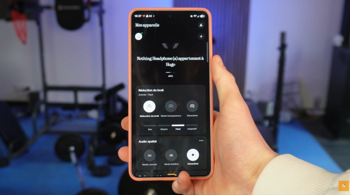 L’utilisation optimale du casque passe par l’application Nothing X. Je trouve cette interface mobile vraiment très bien pensée. L’écran principal affiche immédiatement le nom de votre appareil. Vous accédez directement aux paramètres de réduction de bruit. Je peux activer ou désactiver cette fonction très facilement.